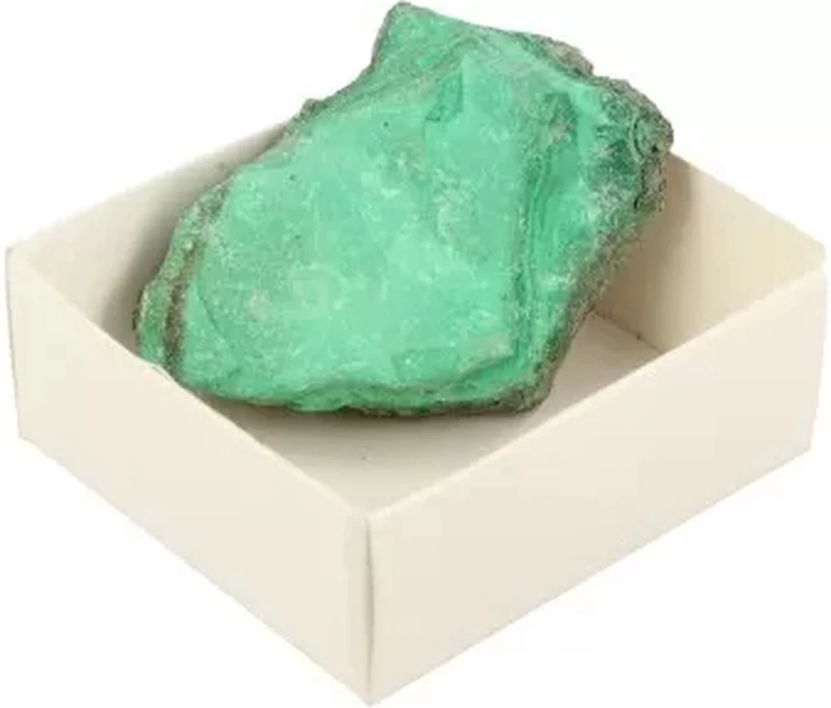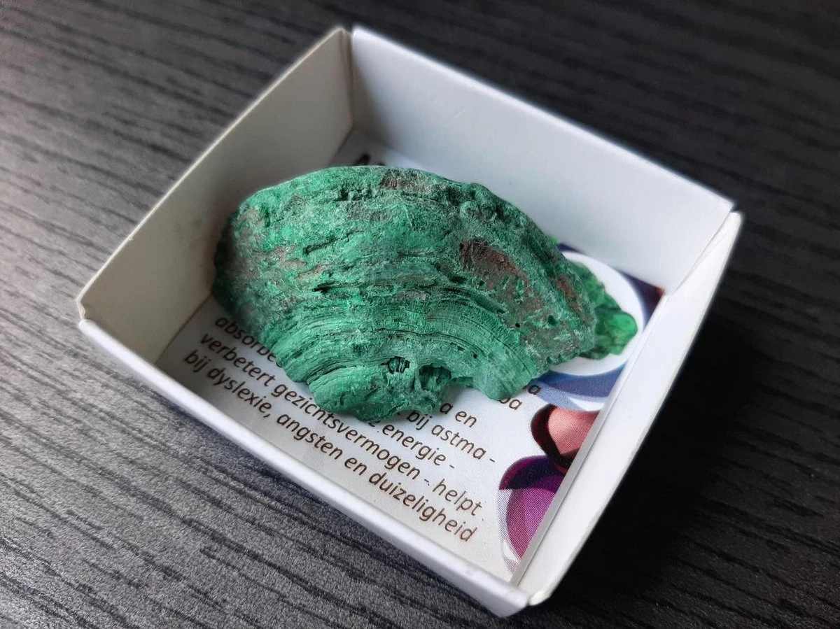 Ruw stukje Malachiet in een handig doosje van 45×50 mm.