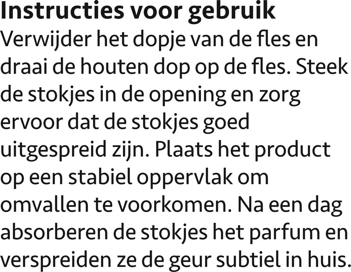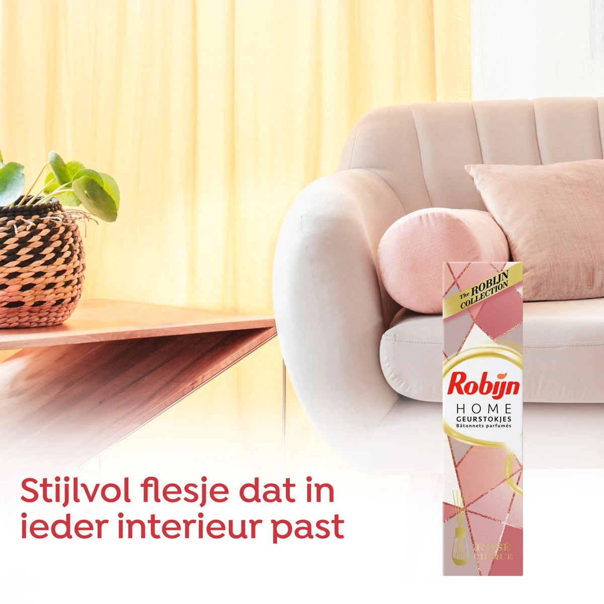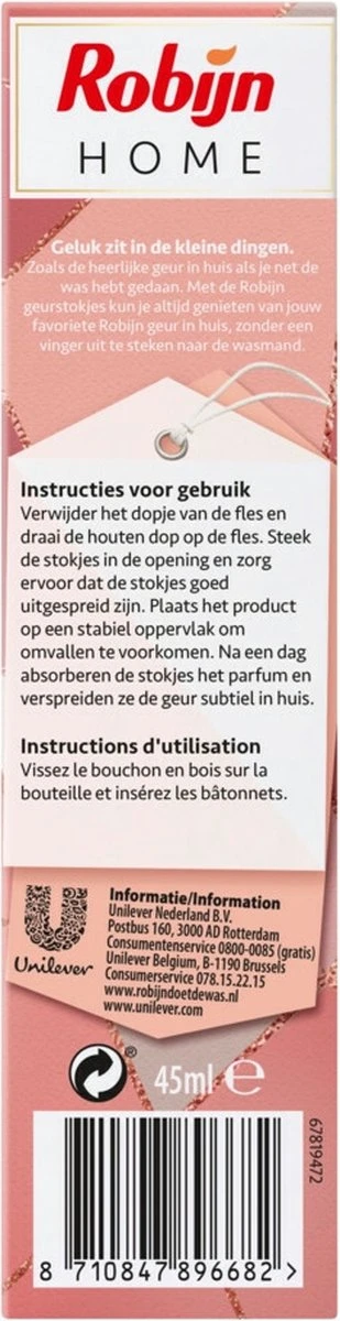 Geluk zit in de kleine dingen. Zoals de heerlijke geur in huis als je net de was hebt gedaan. Robijn Home Geurstokjes met de frisse geur van Rose Chique verspreiden het parfum subtiel in huis. Zo kun je altijd genieten van jouw favoriete Robijn geur, zonder een vinger uit te steken naar de wasmand. Al jaren lang staat Robijn bekend om haar heerlijke geuren voor de was. Maar het liefst heb je deze geuren niet alleen voor je wasgoed, maar ook op andere plekken in het huis. Daarom is Robijn in 2018 begonnen met de Robijn Home geurstokjes. De natuurlijke rotanstokjes verspreiden de geur subtiel in huis. Op deze manier kom je altijd in een heerlijk fris huis thuis. Het stijlvolle flesje met geurstokjes staat mooi in ieder interieur. Perfect voor gebruik in de woonkamer, slaapkamer en badkamer. Gebruiksaanwijzing: draai het witte dopje van het glazen flesje en plaats vervolgens het houten dopje op het flesje. Steek de stokjes in de opening en zorg ervoor dat de stokjes goed uitgespreid zijn. Plaats het product op een stabiel oppervlak om omvallen te voorkomen. Na een dag absorberen de stokjes het parfum en verspreiden ze de geur subtiel in huis. Probeer voor de afwisseling ook eens de andere geuren: Morgenfris, Pink Sensation, Zwitsal en Paradise Secret.