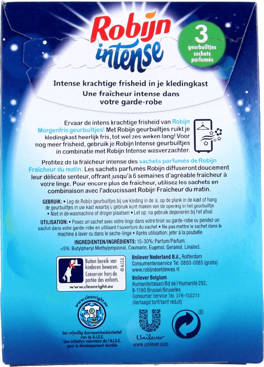 • Elk pakje Robijn Intense Geurbuiltjes bevat 3 sachets met parfumparels