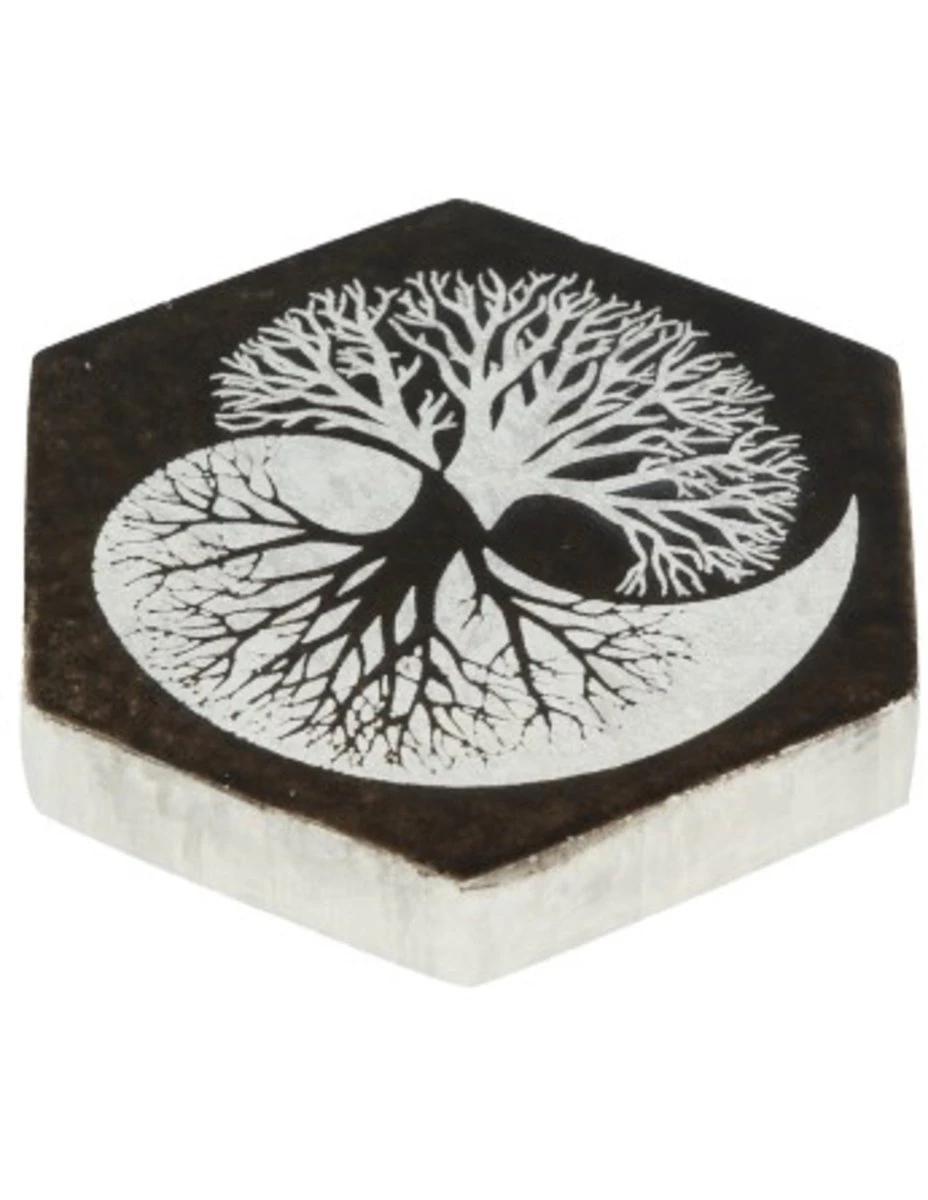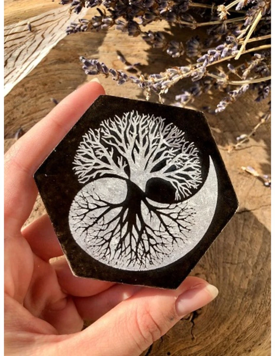 Zeshoekige oplaadsteen van ca. 7×7,5 cm van Seleniet met gravure van een levensboom. Ideaal om kleine steentjes op te leggen om op te laden. Herkomst Marokko en ca. 100 gram.
